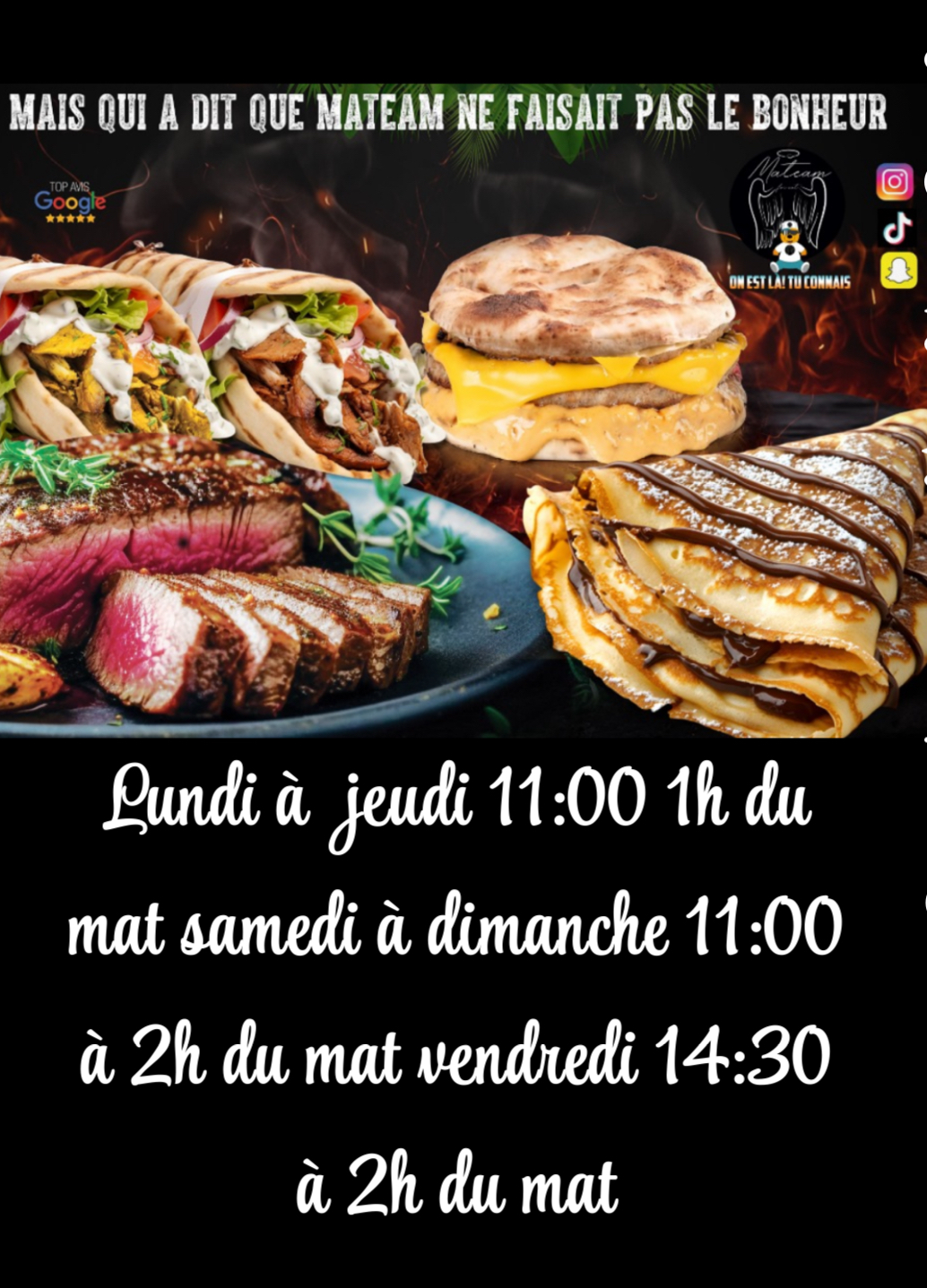 Mateam est situé sur Garges les Gonesse restaurant très convivial en famille comme avec des amis nous sommes bien installés parking en face de la poste près du lycée note sur Google 4,8⭐️⭐️⭐️⭐️⭐️ nous vous accueillons comme des rois vous ne serais pas du tout dessus à très vite